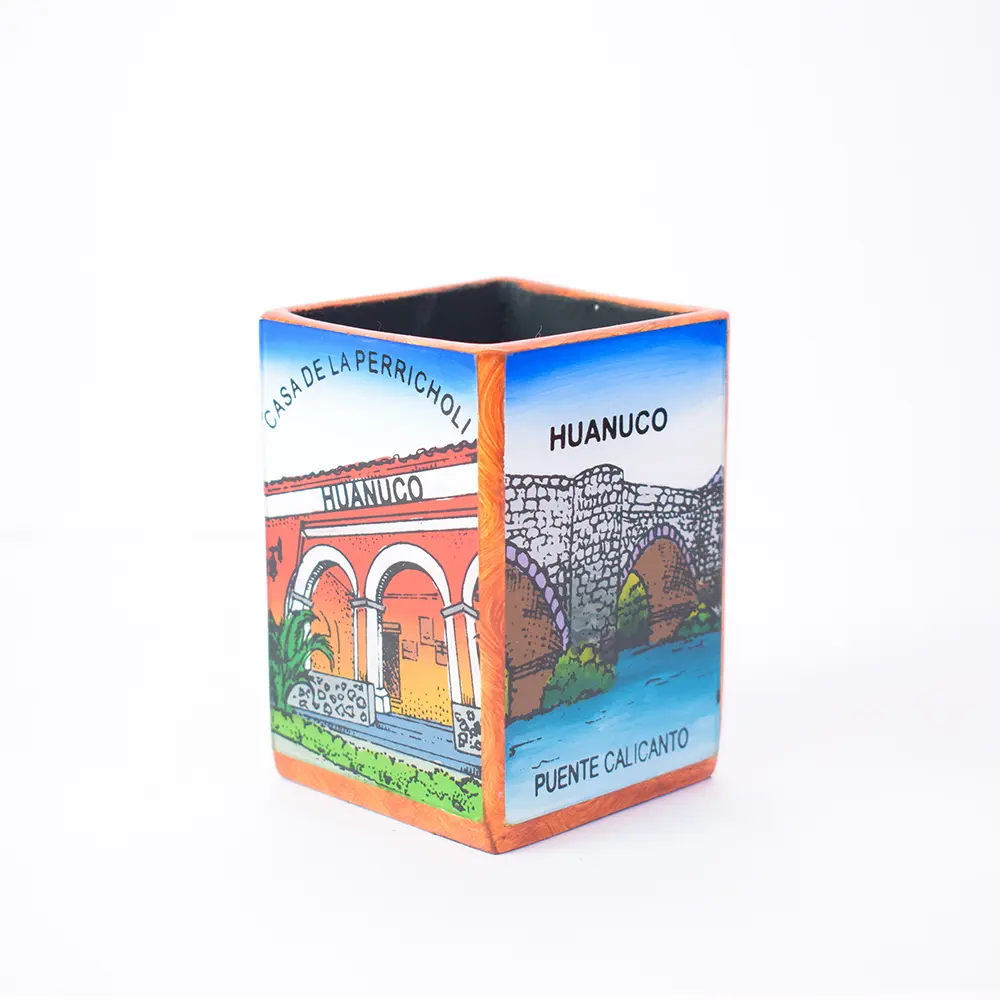 Portalapicero de madera y vidrio con motivos turísticos de Manos Cruzadas, Puente Calicanto, Los Negritos de Huánuco y la Casa de la Perricholi. Color: Claro