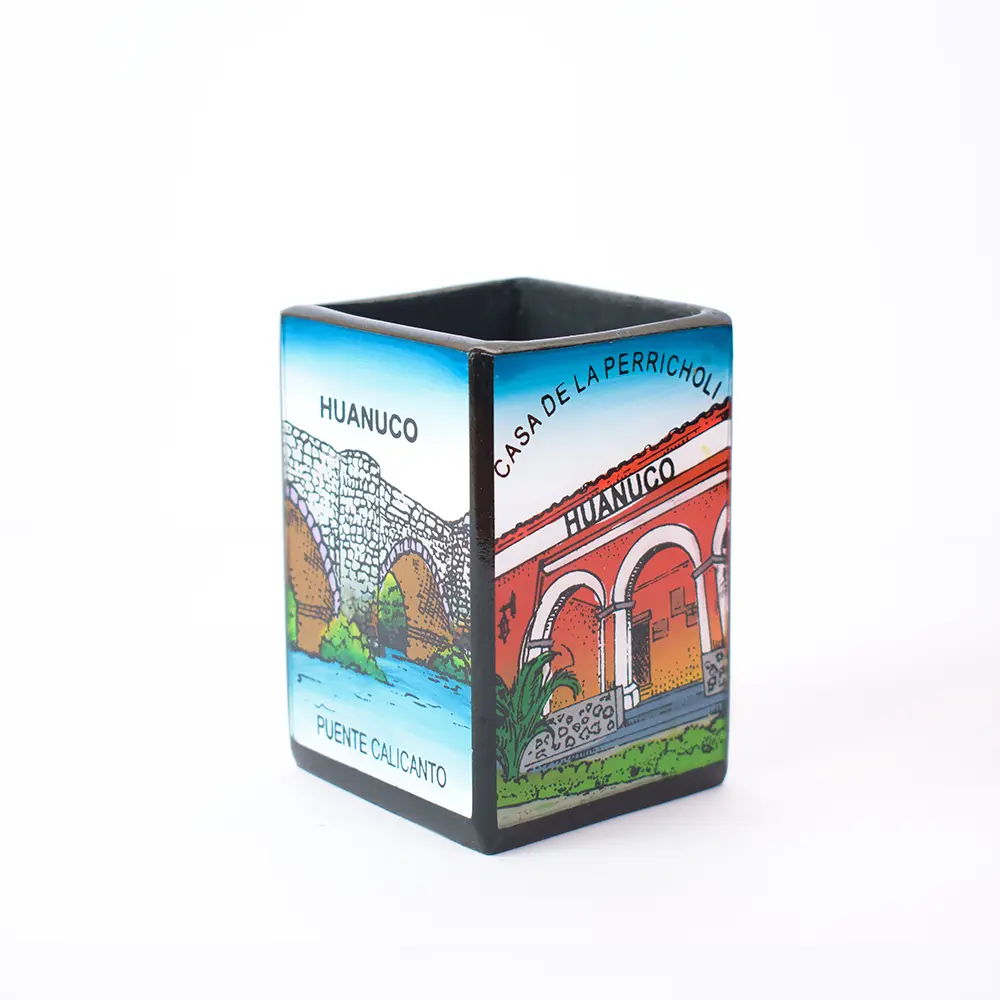Portalapicero de madera y vidrio con motivos turísticos de Manos Cruzadas, Puente Calicanto, Los Negritos de Huánuco y la Casa de la Perricholi Color: Oscuro